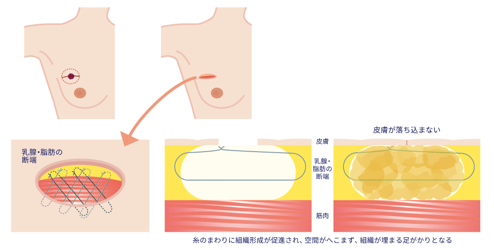 またそのすき間には組織液が貯留し、縫合糸を足場に組織形成が促進され、すき間が結合織・脂肪組織に置き換わり乳房が元の形態を保ちやすくなります。切開の追加や組織の移動を必要としないので患者さんにも優しい手術です。
