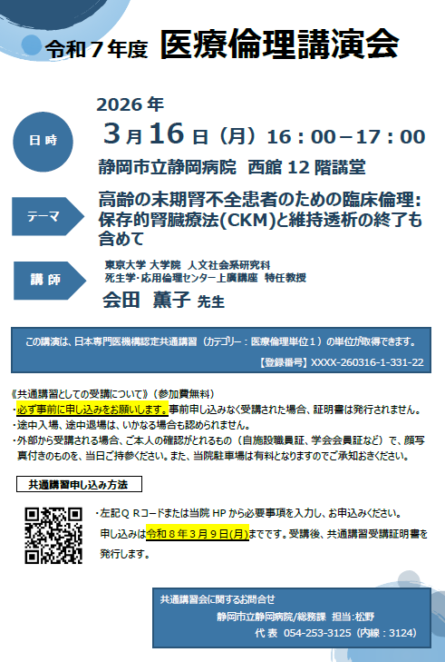 下記日時にて、医療倫理講演会を開催いたします。